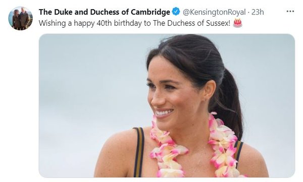 أما الأمير ويليام وزوجته كيت ميدلتون عايدا ميغان ماركل، فغردا بالقول "نتمنى لك عيد ميلاد سعيد دوقة ساسكس".