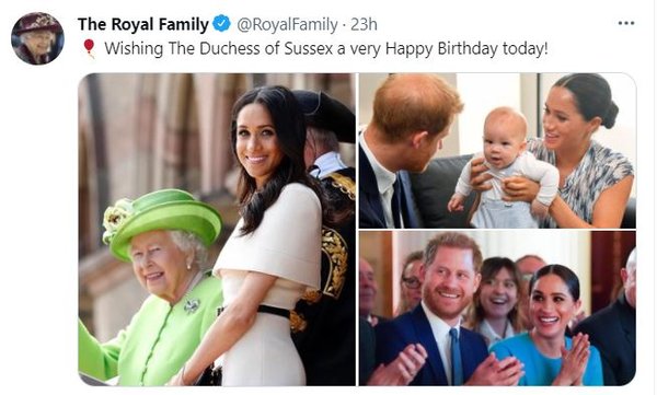 وأتت المكلة إليزابيث في مقدمة الأشخاص الذين عايدوا ميغان، حيث نشر الحساب الرسمي للملكة على تويتر مجموعة من الصور التي تجمع ميغان وعائلتها وصورة مع الملكة إليزابيت مرفقة بعبارة "أتمنى لدوقة ساسكس ذكرى مولد 40 سعيد".
