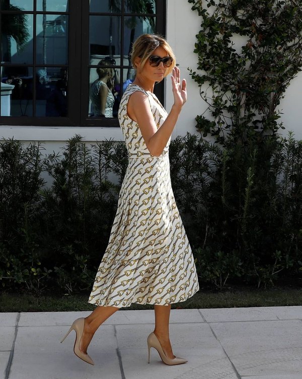وكالعادة، تألقت ميلانيا بإطلالة في غاية من الشياكة، فقد اختارت فستاناً متوسط الطول من علامة Gucci، منقش بطبعة السلاسة الذهبية التي تشتهر بها الدار، نسقته مع حذاء بالكعب العالي باللون النيود من علامة Christian Louboutin مع حقيبة باللون نفسه لكن من Hermes.