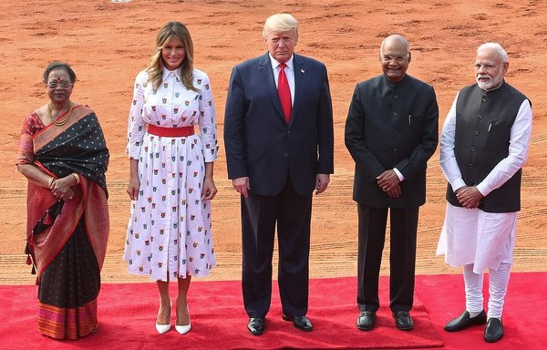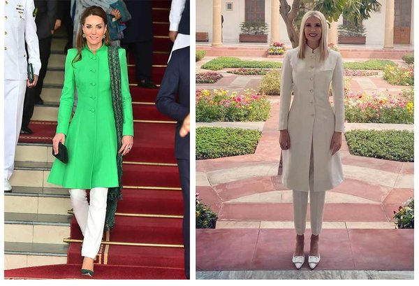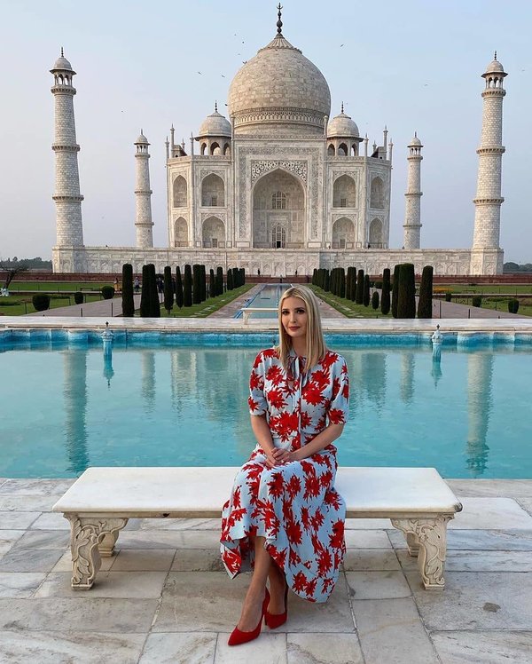 ومن خلال متابعتنا للجولة، لاحظنا أن هنالك تشابه كبير في الإطلالات! فخلال زيارة كلّ من الرئيس الأميركي دونالد ترامب وزوجته إلى أهم المعالم السياحية تاج محال، تألّقت ميلانيا بجامبسوت أبيض من تصميم Atelier caito Herve Pierre وقد أضافت إلى خصرها وشاحاً يعرف باسم SASH وهو من الحرير وباللون الأخضر مع التطريزات الذهبية.