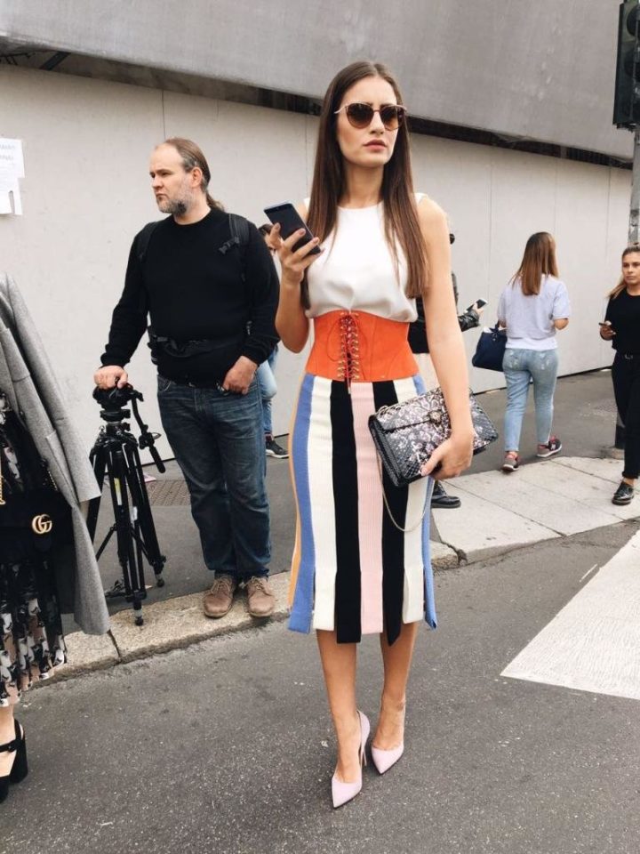 أما لأزيائها، فقد اختارت تنورة متوسطة الطول ذات خطوت ملونة من تصميم Salvatore Ferragamo، وحقيبة يد من إبداعات الماركة الإطالية الفاخرة Bulgari ونظارات شمسية أيضا من Bulgari، ولإبراز رشاقة منطقة الخصر وضعت وحزام عريض بلونه البرتقالي من تصميم Elisabetta Franchi ، أما الحذاء الذي تميز بتصميمه المروّس من توقيع Santoni.