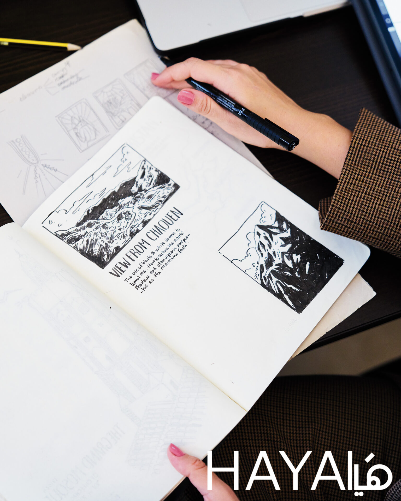 تكمل “أعتقد أن هذا هو سبب بدئي بالرسم أثناء السفر. في البداية، كنت في إجازة وقلت لنفسي: لا أريد الرسم، لكن عندما بدأت برؤية المناطق والمعالم الطبيعية في جورجيا أو أوزبكستان أو المغرب مثلاً، كنت أقف عاجزة عن استيعاب الجمال الذي يحيط بي ويملؤني بشعور غامر. كان الإحساس كبيراً جداً فلم أستطع منع نفسي من الرسم، وترك الشعور يتمدد وينسكب على الصفحة، وهذا ما أعتبره ترفاً… أن أكون قادراً على الجلوس هناك، والتأمل في هذه الأماكن بعمق، ثم مشاركة اللحظة، من خلال لقطة سريعة، أو رسم تخطيطي، أو لوحة”.