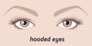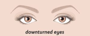 العيون المقلوبة للأسفل هي عندما تتدلى الزاوية الخارجية للعين للأسفل، مما يعطي مظهرًا حزينًا أو متعبًا. قد يبدو هذا الشكل أضيق من أشكال العيون الأخرى بسبب الترهل. غالبًا ما يبدو الجفن السفلي لهذا الشكل من أشكال العيون أكثر سمكًا من العين المقلوبة للأعلى.