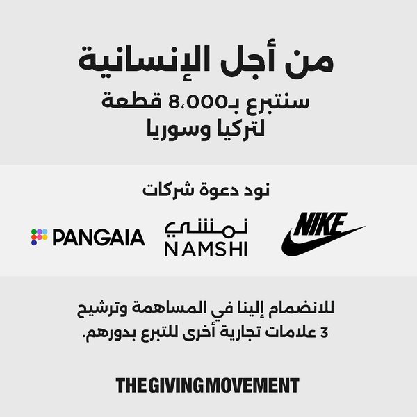 هذا وتوجهت The Giving Movement بدعوة إلى أكبر صانعي التغيير في الوطن العربي للانضمام إلى المبادرة لمضاعفة التأثير: بانجايا ونمشي ونايكي – وترشيح 3 علامات تجارية أخرى للتبرع بدورهم.