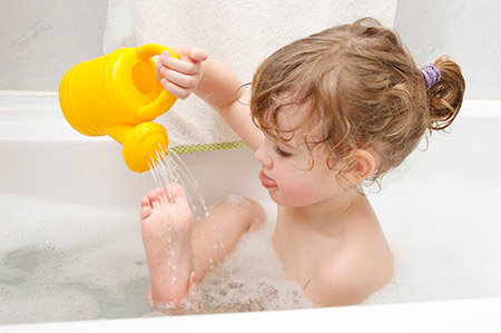 من الضروري اعتماد شامبو للأطفال غير مسيل للدموع ولطيف على الرأس والبشرة مع ضرورة الابتعاد عن ألعاب الحمام، لكن من الشهر الثاني قد تحتاجين للعبة أو أكثر معك في الحمام أثناء تحميمه. واختاري إسفنجة خاصة بالرضع ومن المهم اختيار نوعية لطيفة ورقيقة مناسبة لبشرة الصغير حتى لا تجرحها أو تؤذيها. ومناديل مبللة غير المعطرة والتي تسمح لك بتغيير الحفاظات دون ماء وصابون أو لمسح المنطقة التناسلية لطفلك قبل غسلها جيدًا قبل الاستحمام أو خلال اليوم.