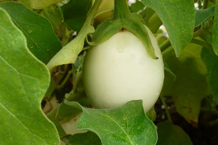 توجد أنواع عديدة من الباذنجان الأبيض، لكن تتميّز كل أنواعه بقشرته البيضاء الناصعة. أما من الداخل، فهو مطابق للباذنجان العادي. في الواقع، كان الباذنجان أبيض اللون في الأصل، لكن مع مرور الوقت، تراجع انتشاره لصالح الباذنجان الكروي الأكثر مقاومة للحشرات والجفاف. ولهذا السبب، فإن معظم الأنواع البيضاء المتوفرة اليوم هي أنواع تراثية.