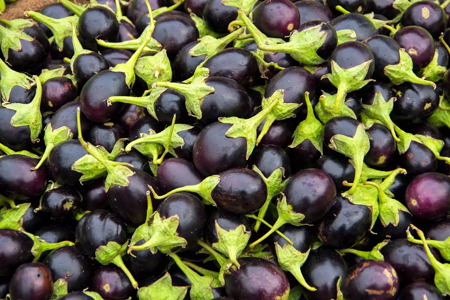الباذنجان الهندي صغير الحجم. تُعرف هذه الفصيلة من الباذنجان أيضاً باسم الباذنجان الصغير. تتميز بلونها الداكن المائل إلى البنفسجي المحمر وشكلها الدائري. وتُستخدم بكثرة في الأطباق الهندية مثل الكاري. يُمكن تقطيعه وقليه أو تكسيره وطهيه على نار هادئة.