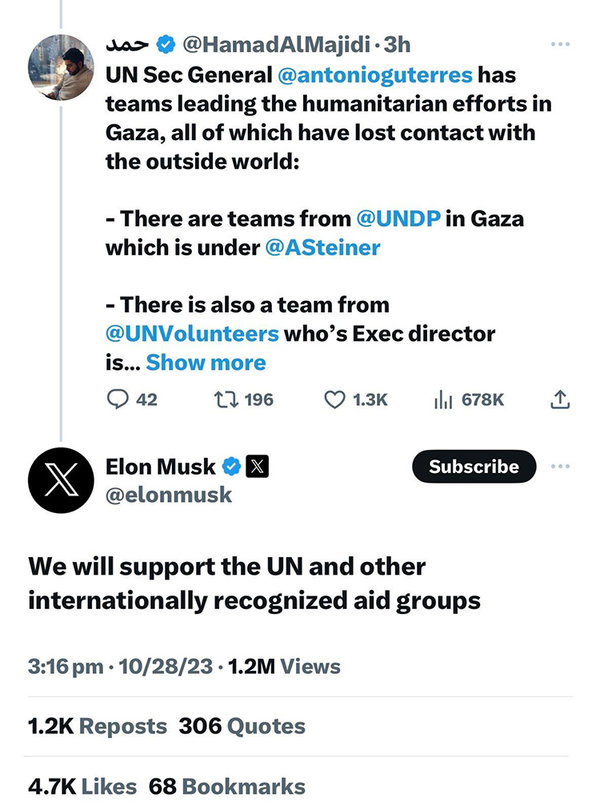 حظي المدّون الإماراتي حمد الماجدي بإشادات ودعم بعد أن رد ايلون ماسك شخصيًا عليه على منصة إكس المعروفة سابقًا بتويتر والتي صرح فيها ماسك أنه سيزود فقط المنظمات الإنسانية الدولية: "سوف ندعم فرق الأمم المتحدة وغيرها من منظمات الإغاثة المعترف بها دولياً".