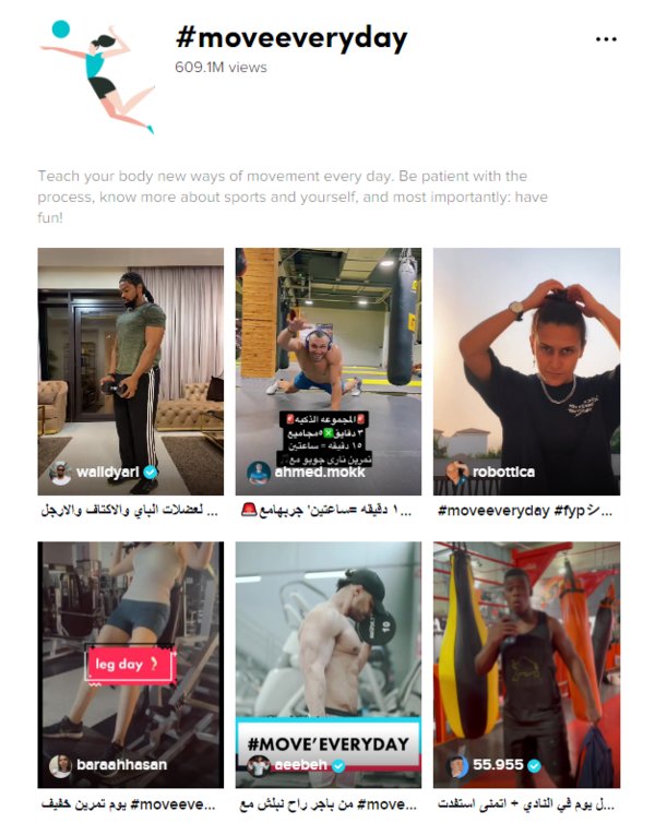 لذلك، بدأ عشاق اللياقة البدنية من مستخدمي تيك توك في تركيز طاقاتهم على عرض أساليب جديدة ومرحة للحفاظ على لياقتهم وصحيتهم وتشجيع الآخرين على اتباعها. لذلك، تم إطلاق هاشتاغ MoveEveryDay#.