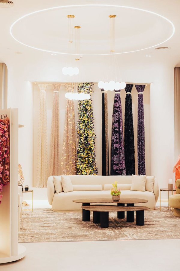 على عكس متاجر الأقمشة التقليدية حيث يتم تكديس المنسوجات على شكل لفات، تحرص العلامة على تقديم القطع بطريقة مختلفة وفنية.