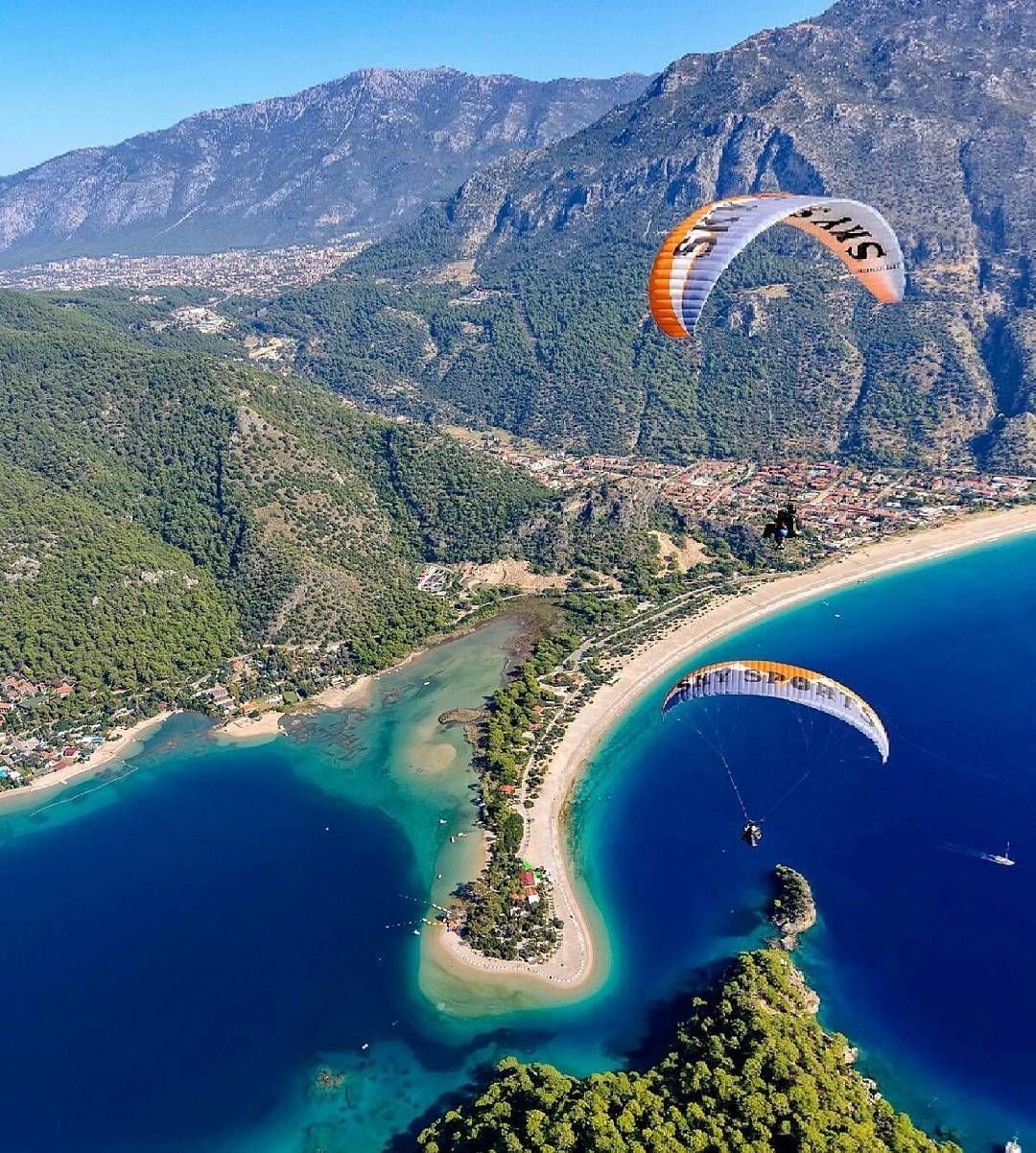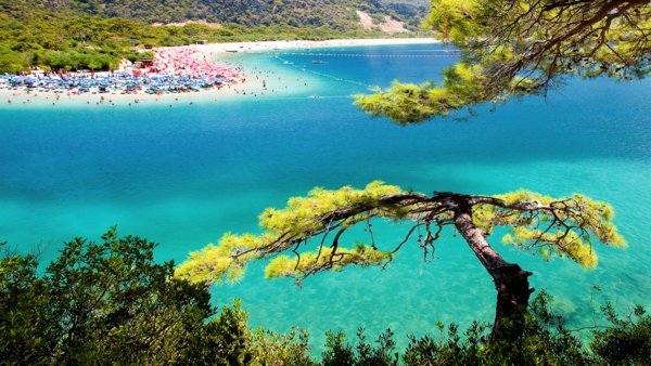 غابة خضراء مورقة تنحدر إلى شاطئ ذو رمال بيضاء. يعد مدخل أولودينيز المحمي، الذي يقع على مسافة قصيرة من فتحية، أشهر شاطئ في تركيا، مع المناظر الطبيعية التي ربما تكون قد سقطت من بطاقة بريدية مثالية.