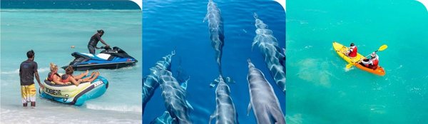 إذا تحبين المحيط، فلا تُحصى التجارب التي يمكنك خوضها هنا في جزر المالديف. بدءاً بالسباحة في المياه الضحلة، وممارسة سباحة الـ snorkelling فوق الشعاب المرجانية الغنية، والغوص مع الأسماك الملونة، والغوص العميق لاستكشاف أعماق المحيط، وصولاً إلى المشاركة في نشاط شيّق للرياضات المائية، يمكن للجميع أن يستمتع. فجزر المالديف تتمتع بالكثير من أماكن الغوص، وهي مليئة بالشعاب المرجانية الرائعة والمخلوقات البحرية. وتعني عطلة في جزر المالديف أيضاً أن هناك عدداً لامتناهياً من أنشطة الرياضات المائية، مثل ركوب الـjet ski والقوارب والزوارق ذات القاع الزجاجي، والإبحار بالطوافات، وركوب الأمواج kite surfing، وحتى التزلج الهوائي parasailing لمحبّي المغامرات. ويمكنك المكوث في منتجع أو فندق أو دار ضيافة أو قارب قابل للسكن والاستمتاع بأي من هذه الأنشطة. ويوفر التنوع البيولوجي الغني لبحرنا عالماً جديداً بالكامل لأولئك الذين يسعون إلى المغامرة تحت سطح البحر. وتنعم جزر المالديف بأكثر من 200 نوع من الشعاب المرجانية وأكثر من ألف نوع من الأسماك و400 نوع من الرخويات و350 نوعاً من القشريات البحرية. وتشمل التجارب في جزر المالديف في الكثير من الأحيان رصد الدلافين أثناء رحلات غروب الشمس، والسباحة مع أسماك الـ manta ray، والسباحة، ومشاهدة سمكة قرش الحوت من مسافة بعيدة.