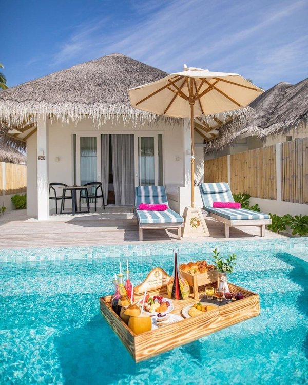 استمتعي بتناول أشهى إفطار في الماء! نعم، أغلبية المنتجعات في المالديف تقدم وجبة الإفطار العائم في حوض السباحة الخاص بجناحك ذات الأفق اللامحدود.