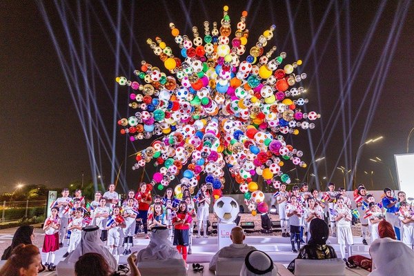 وفي التفاصيل، صممّ تشاوي يونغ مجسمًا يتكوّن من خوذات العمّال تقديرًا لتفانيهم في العمل من أجل دعم دولة قطر خلال تحضيراتها لمونديال 2022 علاوةً على كرات من المرايا.
