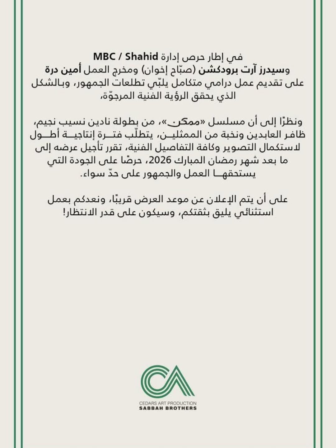وأوضح البيان الصادر عن إدارة MBC ومنصة شاهد، بالتعاون مع شركة سيدرز آرت برودكشن والمخرج أمين درّة، أن مسلسل ممكن يحتاج إلى وقت إنتاجي إضافي لاستكمال التصوير، وذلك حرصًا على أعلى معايير الجودة.
