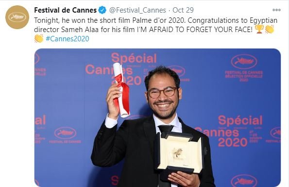 في التفاصيل، استطاع الفيلم المصري القصير "ستاشر: أخشى أن أنسى وجهك" I’m afraid to forget your face أن يحصد جائزة السعفة الذهبية كأفضل فيلم روائي قصير بعد منافسة 11 فيلماً قصيراً ليكون أوّل فيلم مصري قصير يشارك في المسابقة منذ 50 عاماً.