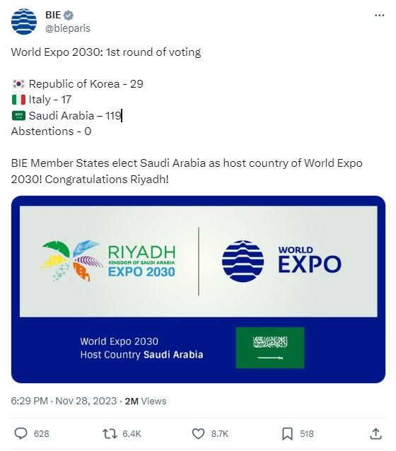 هنيئًا للمملكة العربية السعودية إستضافتها اكسبو 2030 في العاصمة الرياض حيث فاز الملف المقدم من قبل الدولة بعد أن حسمت الجمعية العامة للمكتب الدولي للمعارض المنافسة لصالح المملكة ضد إيطاليا وكوريا.