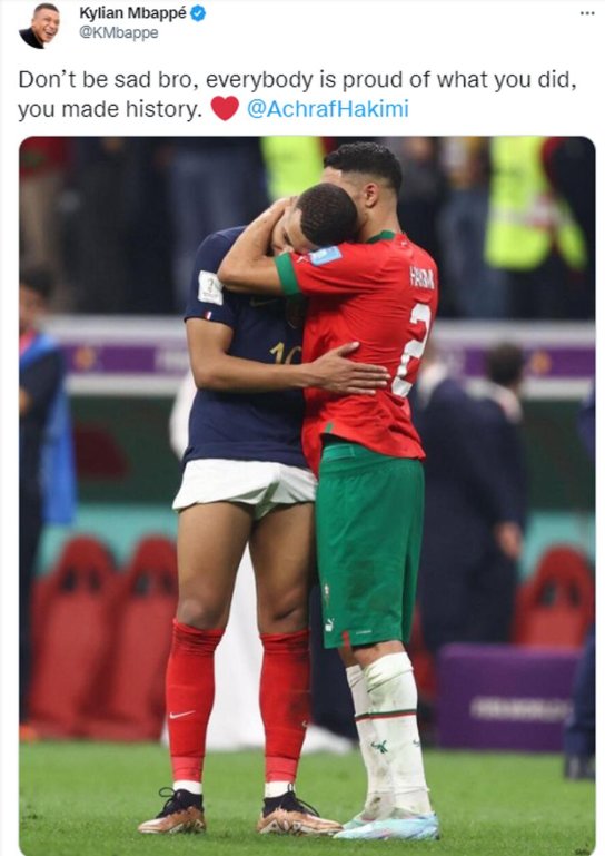 أسوأ ما يمكن لصديقين مواجهته هو الوقوف ضدّ بعضهما البعض في مباراة مصيرية كتلك التي جرت بين المغرب وفرنسا إلا أنّ الإحترام الكبير جعل اللاعبين يتبادلان قمصان منتخباتهم، فعانقا بعضهما البعض وهمس مبابي في أذن صديق العمر وكأنه يقول له: حظاً سيئًا يا صديقي.