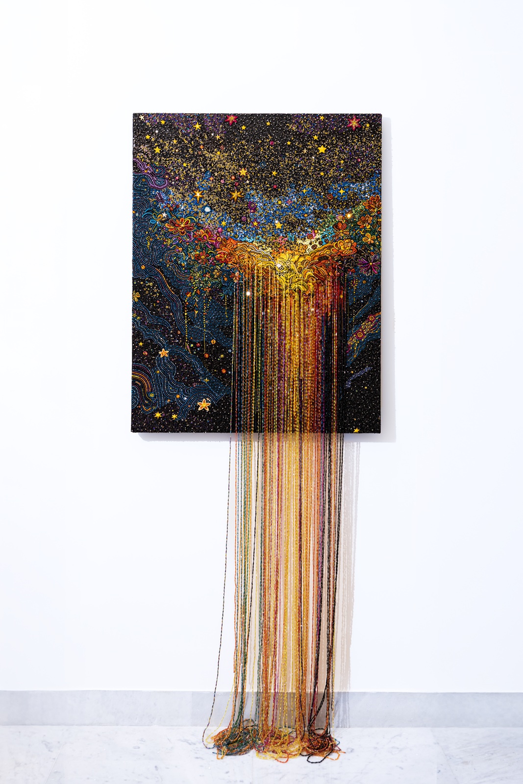 يواصل رامي قاضي في “الكون المزهر” استكشاف موضوع الكون الذي بدأه في مجموعته الأولى، مقدماً تفسيراً فنياً مباشراً وعميقاً لجماليات الفضاء والكون. ويقول قاضي: “أنا مفتون بلا نهاية بهذا التصميم العظيم: معقد، دقيق، جميل ولا نهائي. ومن خلال الأقمشة والخيوط أعبر عن إعجابي بالكون.”