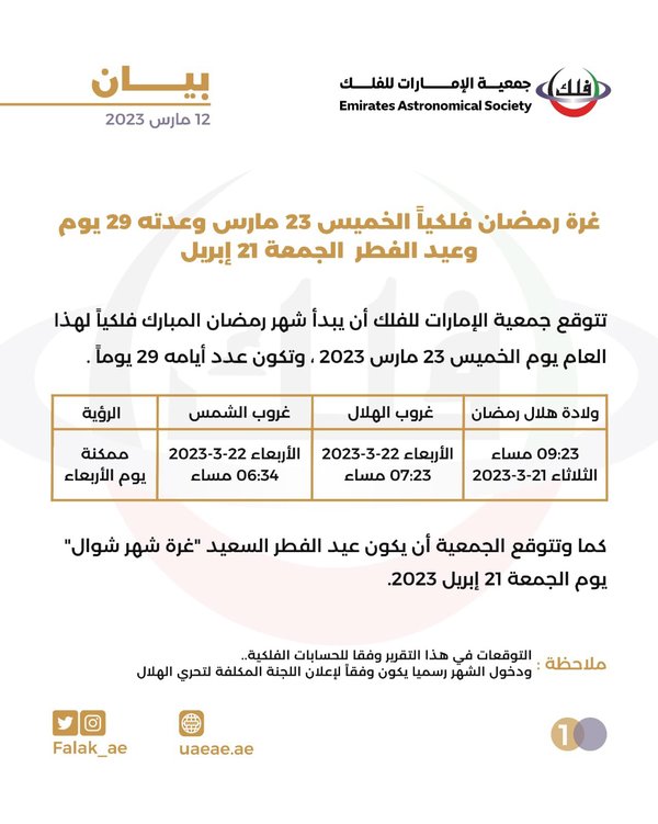 ومن المتوقع حسب الحساب الرسمي للجمعية على تويتر أنّ هلال شهر رمضان سيكتمل يوم الخميس 20 أبريل 2023، فيولد هلال قمر شوال في اليوم عينه. من هنا ستُعتبر الجمعة 21 أبريل 2023 أول أيام عيد الفطر.