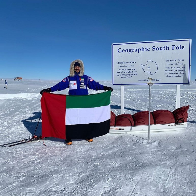 وتابع: “يشرفني أن أضع دولة الإمارات في مقدمة جامعة الدول العربية (22 دولة) كوني أصغر عربي يتزلج في كلا القطبين من دون مساعدة”.