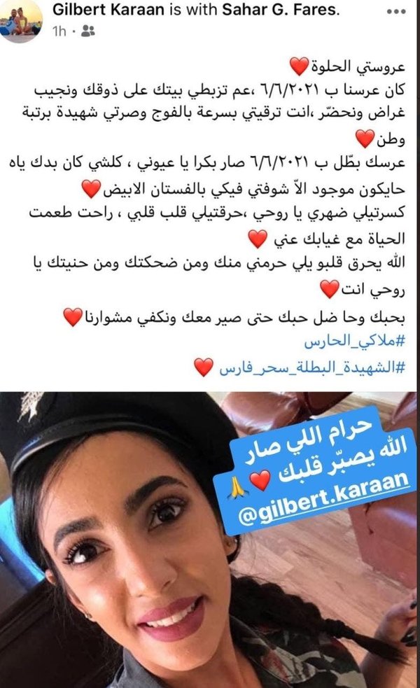 غيابها ترك أثراً كبيراً في قلب خطيبها الذي كان ينتظر بشوق موعد زواجهما ورثاها بكلمات مؤثرة أمس، ولكنه أيضاً أثر فينا جميعاً فهي رمز التضحية والإخلاص في العمل.. إنها المسعفة البطلة سحر فارس التي لم تتأخر لدقيقة عن تلبية نداء الواجب والخروج مع 9 من رفاقها الشباب لإطفاء الحريق الذي اندلع قبل التفجير الكبير، لم تكن تعرف أنها آخر مرة ستخرج فيها لتلبية مهمة إنسانية، فخطفها الموت وهي في عز شبابها. يقول خطيبها " "الله يحرق قلب اللي حرمني منك"، وأضاف: "كسرتيلي ضهري، حرقتيلي قلب قلبي، راحت طعمة الحياة مع غيابك".