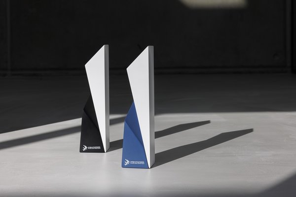 تم تصميم جائزتين باستخدام نفس الفكرة – الجائزة الأولى للفائزين باللون الأزرق، للتركيز على اللون الرسمي للجائزة، والجائزة الرعاه باللون الأسود كعمود فقري قوي.
