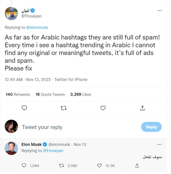 فبعد أن إشتكى الشاب السعودي ثنيان العريفي أنّ الهاشتاغات العربية مليئة بالتغريدات العشوائية قائلًا:" في كل مرة أرى هاشتاغ باللغة العربية ، لا يمكنني العثور على أي تغريدات أصلية أو ذات مغزى ، فهي مليئة بالإعلانات والرسائل غير المرغوب فيها. ارجو الاصلاح"، ردّ عليه ماسك باللغة العربية " سوف نفعل".