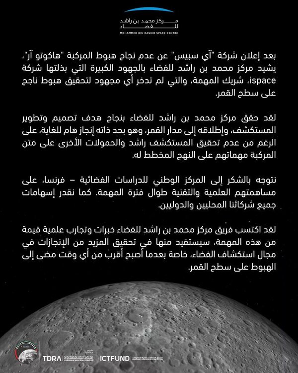 في النهاية، نشرت اليوم صفحة مركز محمد بن راشد للفضاء بيانًا تشكر فيه كلّ الشركاء والعاملين الذين حاولوا أقصى ما لديهم لنجاح هذه المهمة.