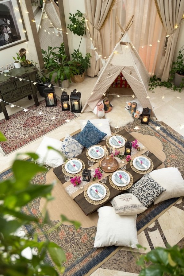 إن مائدة الإفطار والعيد هي أكثر من مجرد طعام. يمكن للمرء أن يختار مفارش المائدة والأواني الفضية اللامعة والشموع العطرية ذات الألوان الترابية. يجب أن تخزن العبوات الفضية الفردية التمور والفواكه المجففة والمكسرات لمزيد من الجاذبية.