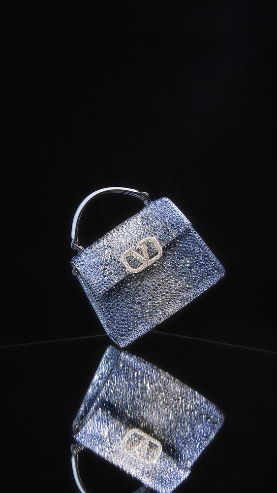 حقيبة في سلينغ VSling من Valentino Garavani المصنوعة من جلود التمساح والثعبان اللماعة، أو المطرّزة بالكامل بكريستالات Swarovski متدرّجة الألوان.