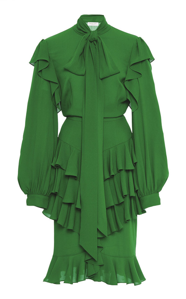 مثلاً، يمكنك أن تختاري فستاناً باللون الأخضر من Michael Kors، وتنسقيه مع حقيبة من Chloe وحذاء بالكعب العالي من Dolce & Gabbana في إطلالة تتميز باللون الواحد.