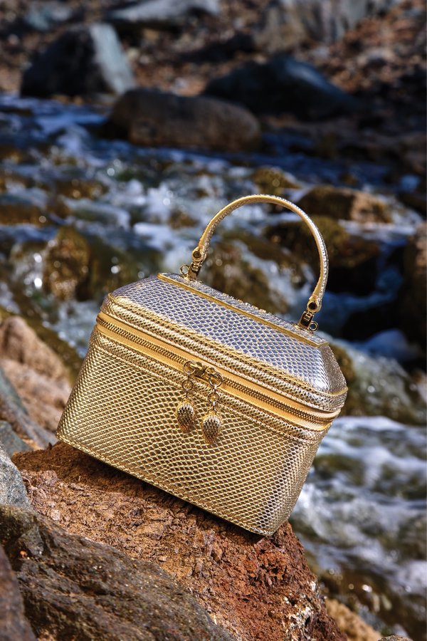 حقيبة Serpenti Forever Gold من جلد Karung باللون الذهبيّ الفاتح، وببطانة من جلد العجل الأسود بنسبة 100%