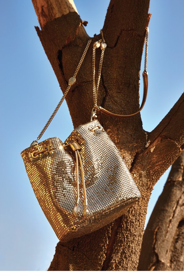 حقيبة Serpenti Forever Bucket من قماش الـ mesh ميتاليكي باللون الذهبيّ الفاتح، وببطانة من جلد العجل بنسبة 100% باللون الذهبيّ اللامع