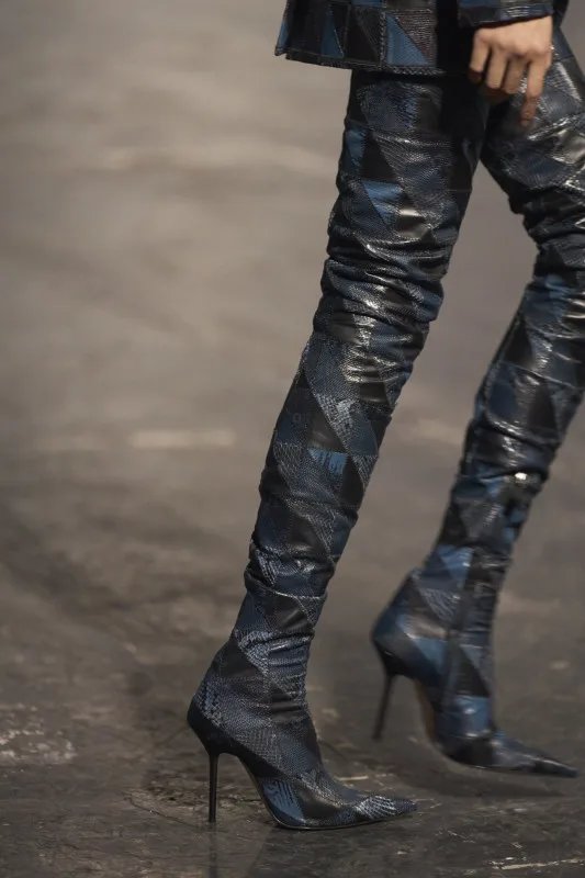وفي ظل تبختر عارضات الأزياء، كان من الضروري أن نلقي نظرة على أحذيتهن من دار شانيل التي اختارت الجلد الى أحذية كوبرني ذات الكعب العالي التي تصل إلى الفخذ، كريستيان لوبوتان الذي دعانا إلى أمسية موسيقية مبهجة، يزيّنها الرقص والموسيقى في مسرح لا تريانون حيث اعادنا المصمم بالذاكرة الى حي بيجال الذي تطورت فيه حرفته وقضى فيه وقتًا مميزًا من حياته.
