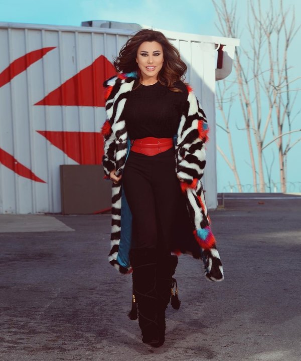 أما نجوى كرم، فاختارت إطلالة مميزة إذ اعتمدت جامبسوت أسود مع حذاء عالي الساق وحزام عريض للخصر. وأكملت إطلالتها بمعطف طويل من الفرو.