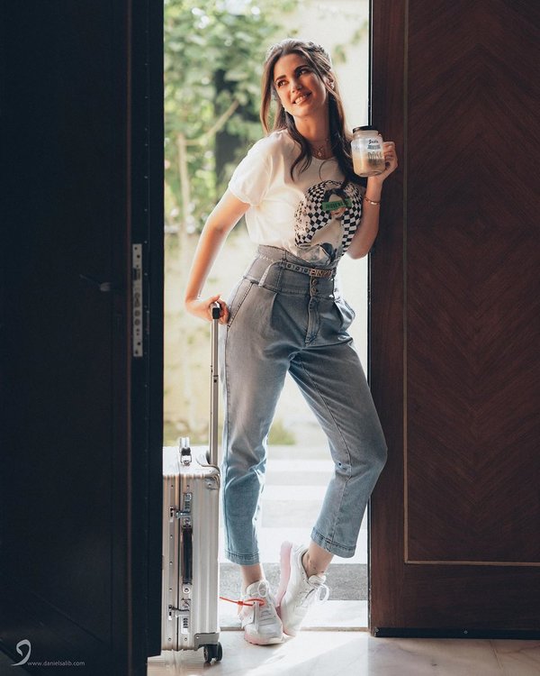 أطلت بالحذاء الرياضي مع سروال من الدنيم في لوك عصري مميز.