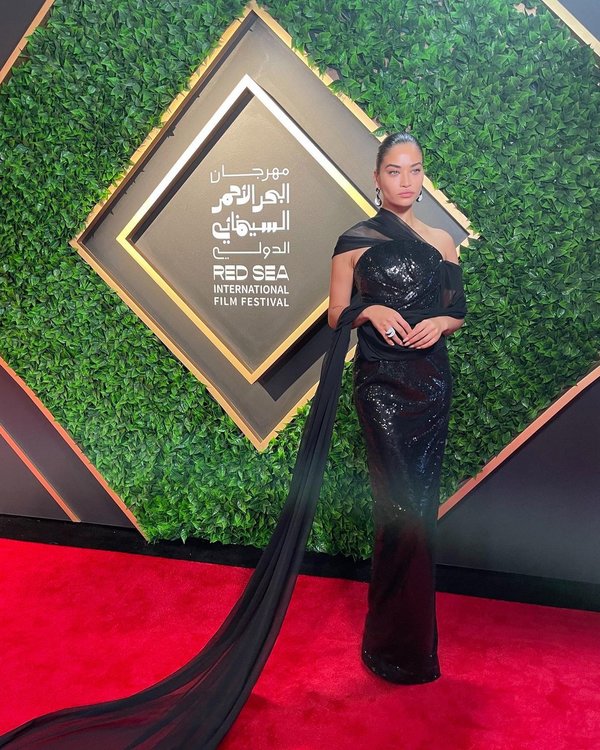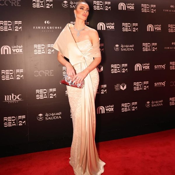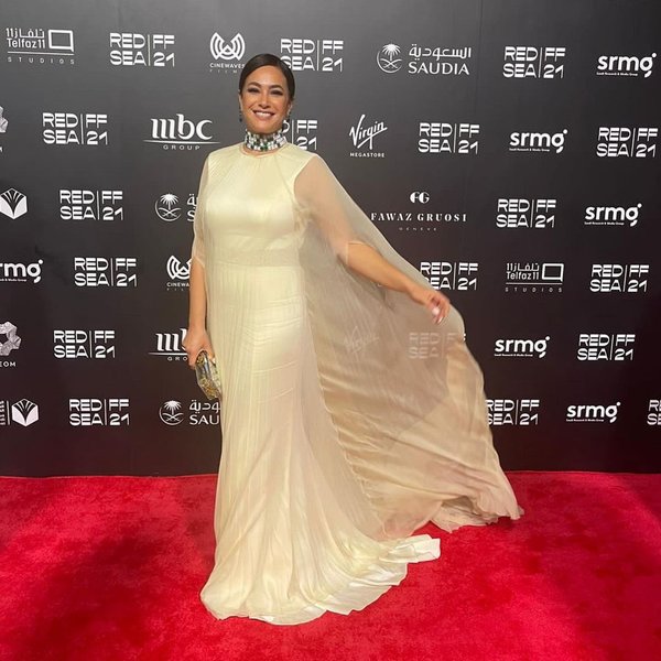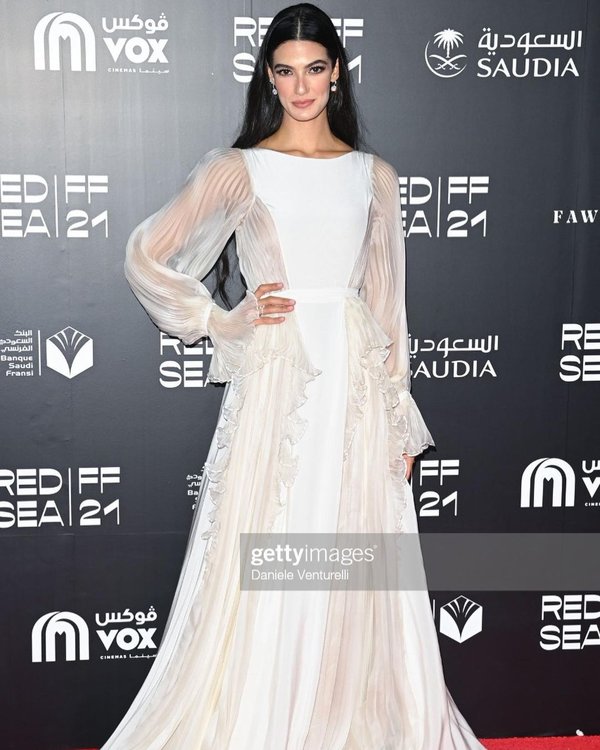 أطلت على السجادة الحمراء في مهرجان البحر الأحمر السينمائي الدولي 2021 بفستان باللون الأبيض ذات الأكتاف الطويلة والشفافة من علامة Harith Hashim.