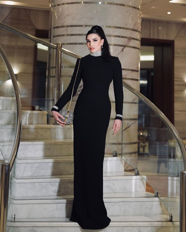 أطلت بفستان أسود تميز بقصتة الضيقة.