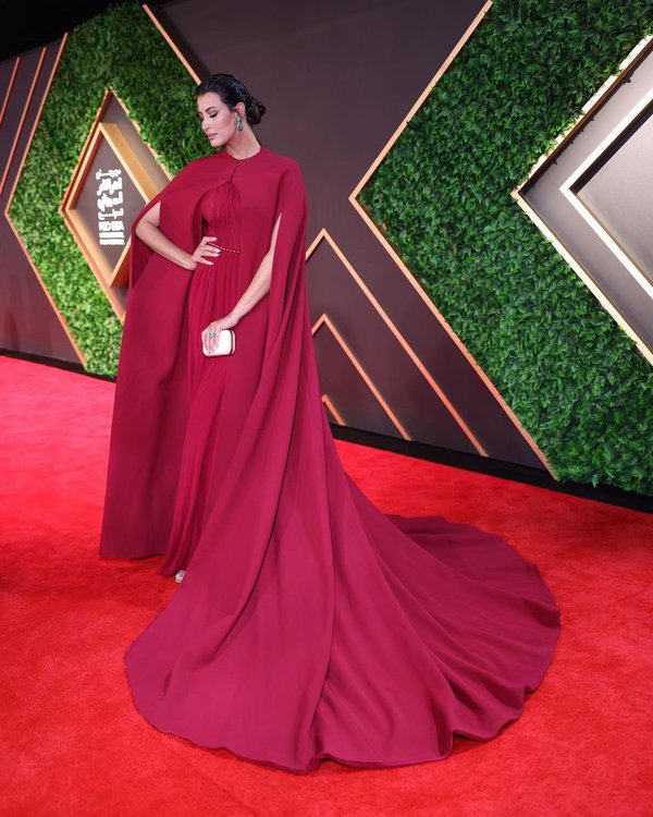 اعتمدت إطلالة جذابة من جورج حبيقة، فأطلت بفستان باللون الأحمر تميز بقصته الإنسيابية ذات الأكتاف بأسلوب الكاب.