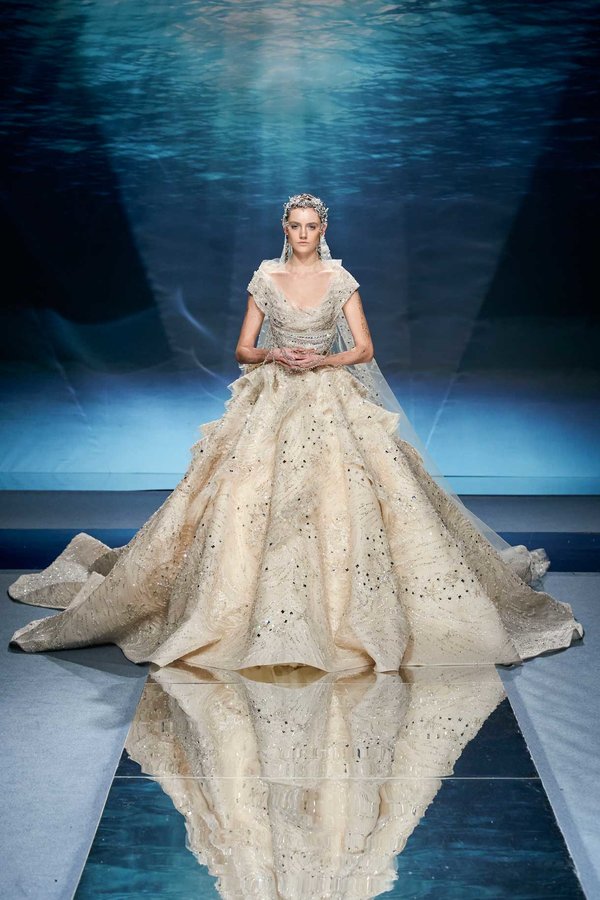 إلى كل عروس تحب الفستان متعدد الطبقات فإنّ تصميم زياد نكد سيكون خيارك، فإلى جانب لونه العاجي يتميز تصميم الفستان بتنورته الواسعة متعددة الطبقات بأسلوب مشابه للكشاكش، وهو مرصع بحبات من السواروفسكي اللامع. وقد تميّز الفستان بجزئه العلوي المزيّن بالسلاسل مع طرحة من التول مزينة بحبات من الأحجار الكريمة.