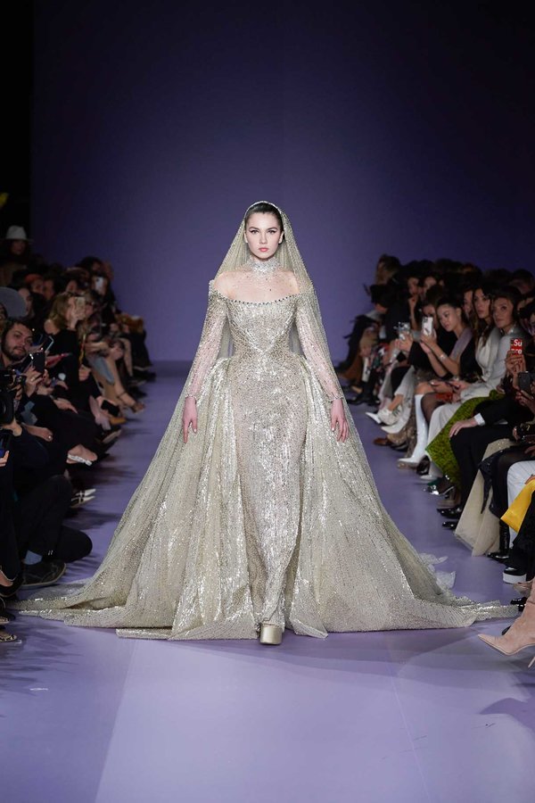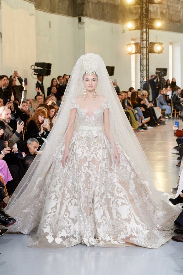 كالعادة، من تختار فستانها من إيلي صعب تتمتع بجرأة كبيرة وبأسلوب مميز. وعروس صيف 2020 ستكون ملكة متوجة على عرش العرائس بفستانها الملكي المزخرف بالدانتيل مع حزام يحدد مفاتنها وقصة صدر مميزة جداً. أما الطرحة، فهي مشغولة بحرفية كبيرة وتحمل بعض التطريزات وتتدلى من تاج ضخم.