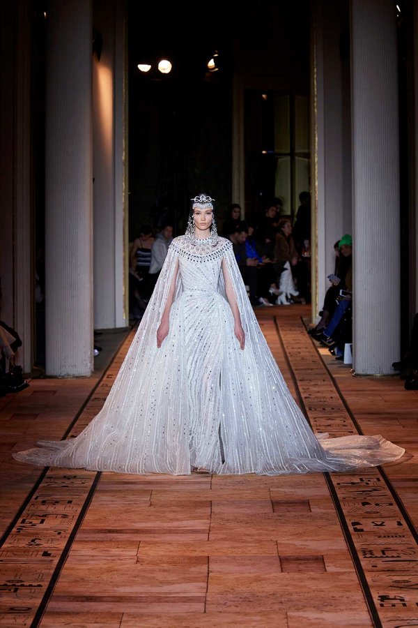 من أسلوب كليوبترا استوحى المصمم العالمي فستان عروسته الذي تميّز بقصته الضيقة التي تحدد الخصر مع تنورة مثبتة عند الأطراف. اللون الأبيض الناصع المرصّع بالأحجار الكريمة التي تتلألأ جعل هذا الفستان أيقونياً بخاصة أن مراد استبدل الطرحة بكاب يتدلى من الكتفين.