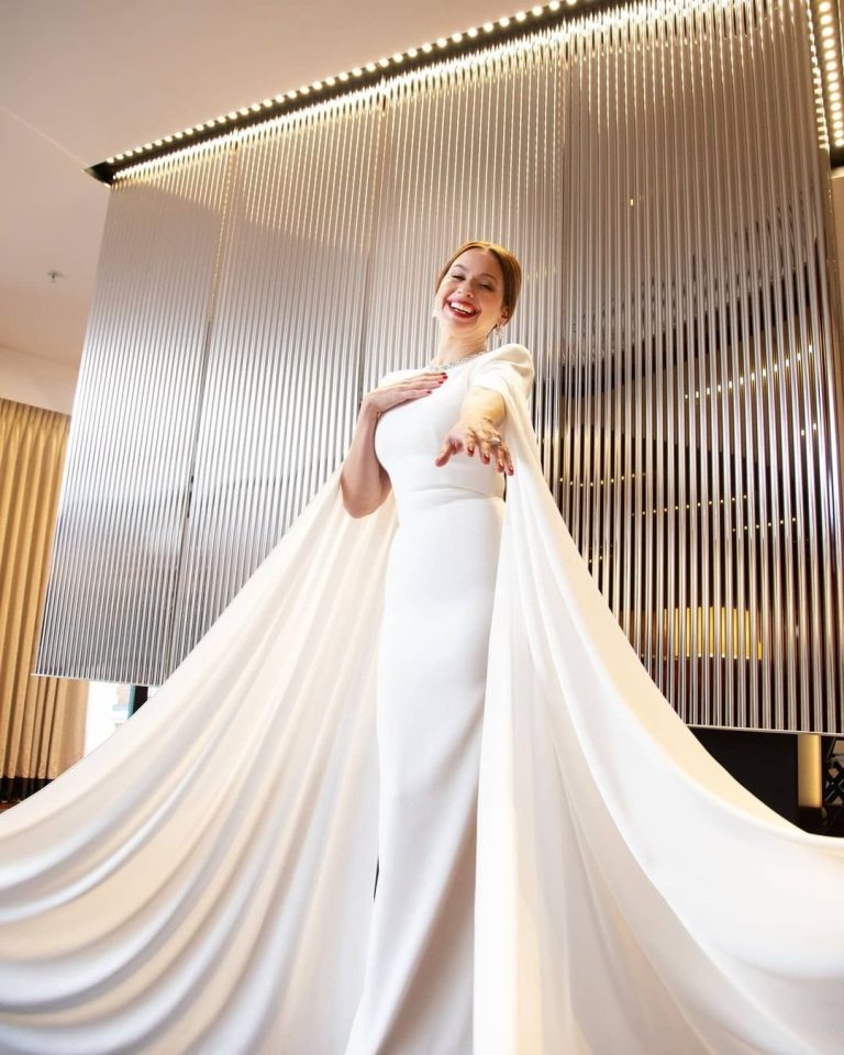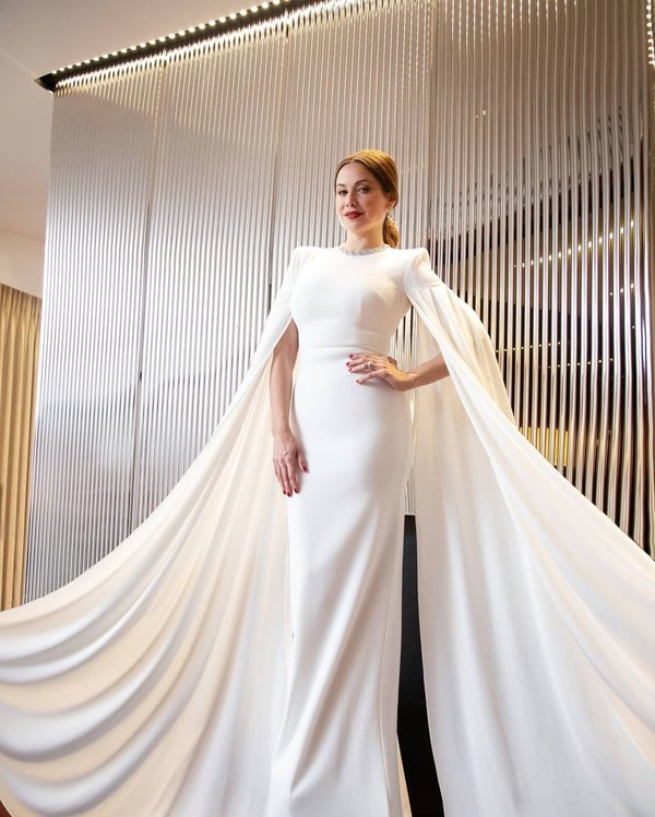 في تفاصيل إطلالة ريا ابي راشد من لندن، فقد اختارت فستاناً أبيض طويل ذو أكتاف عالية، بأسلوب الكاب من ALEX PERRY لدى NET-A-PORTER زينته بمجوهرات ماسية من Bvlgari.