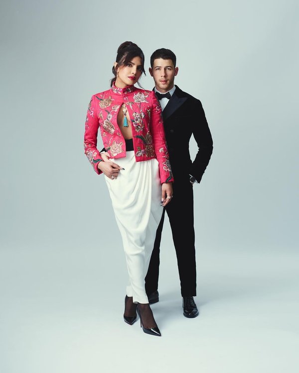 أما بريانكا شوبرا قررت أن تكون إطلالتها جرئية، فنسقت سروالاً أبيض اللون ذات قصة واسعة مع توب مفتوحة ومزينة بالنقشات من علامة Pertegaz. وقد أطلت على السجادة الحمراء برفقة زوجها نيك جوناس.