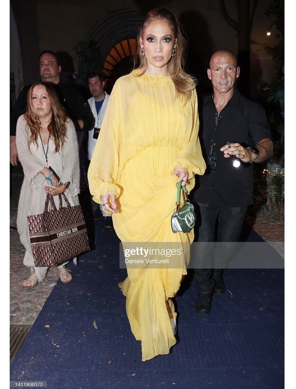وخلال وصولها إلى الحفل، رصدت عدسات الكاميرا جينيفر لوبيز بفستان باللون الأصفر نسقته مع حقيبة Loco Bag من Valentino Garavani.