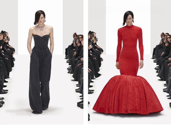 أزياء السهرة في مجموعة بالنسياغا لربيع 2022 أتت بحلة جديدة مع بدلة بسروال من قماش موليتون. كما وتنوعت الفساتين ما بين الدرابيه والمخمل.
