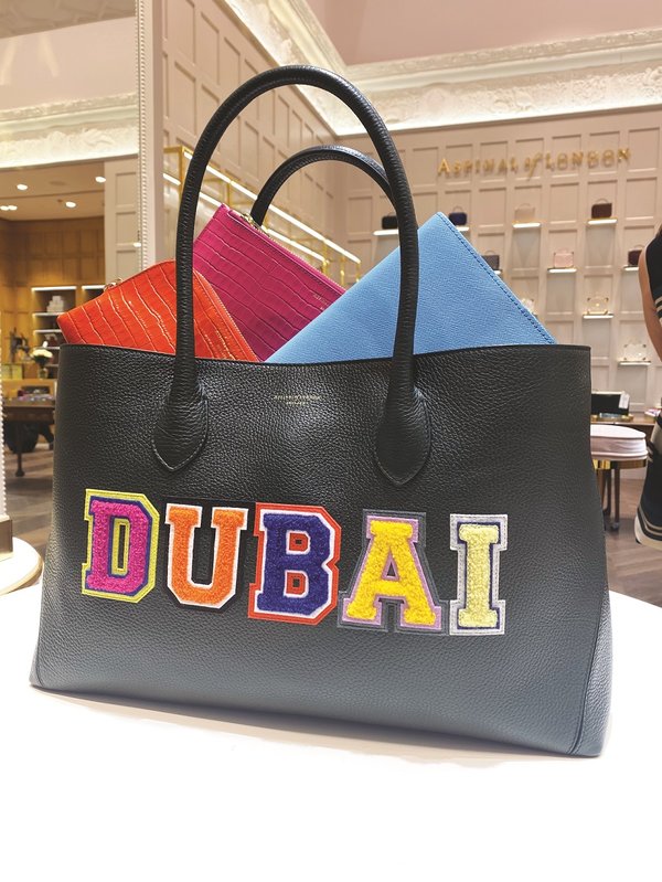 في كلّ مرّة نفتتح فيها متجراً في مدينة ما، أطلق تصميماً مميّزاً مستوحى منها وهذه عادة بدأت بها منذ سنة تقريباً. فعندما افتتحنا متجرنا في دبي مول، عمدت إلى استخدام ملصقات مطرّزة تحمل اسم مدينة دبي. ولكلّ مدينة، أطلق حقيبة خاصّة بها. أعرف أنّ أسلوب الحقائب هذا قد لا يناسب الجميع، غير أنّني أراه تصميماً عصريّاً ورائعاً بحقّ. وهكذا إذاً، ابتكرت لدبي مول ثلاث حقائب محدودة الإصدار هي حقيبة London Tote بألوان الأخضر الداكن والعنّابي والأسود.