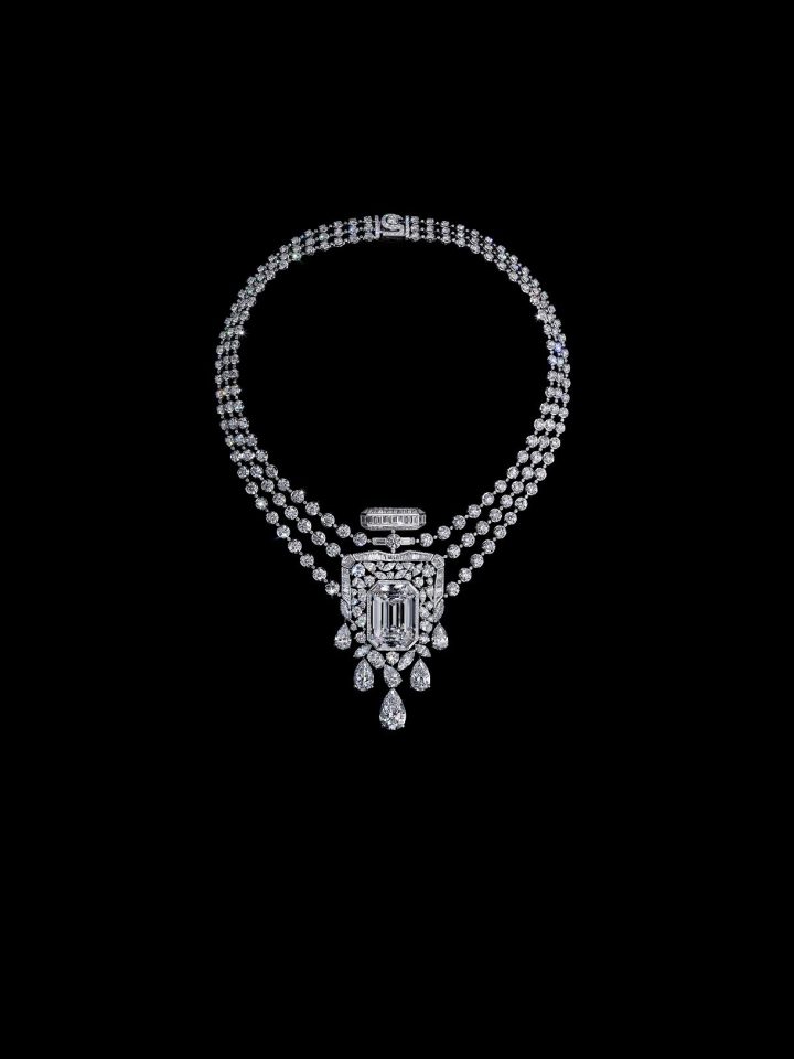 الشكل المتناغم للماسة بقطع زمردي والتي تزن 55.55 قيراطًا، والإطار المصنوع من الذهب الأبيض عيار 18 قيراط المرصع بماسات قطع دائري؛ عددها 104 ماسة، ونوعية الماس فئة D الخالية من أي شوائب تبرهن عن دقة Chanel ودرجة المثالية التي تسعى إليها عندما يتعلق الأمر بالإبداع والبراعة التقنية.
