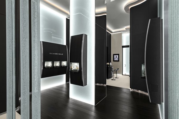 وتغمر المكان الملامح الخاصة بعالم Richard Mille كالخشب الفاخر، الجدران المكسوة بالجلد الأسود الممتاز والأقمشة الراقية التي تجتمع معاً لتضفي على المكان أجواء مثالية لعرض إبداعات العلامة.